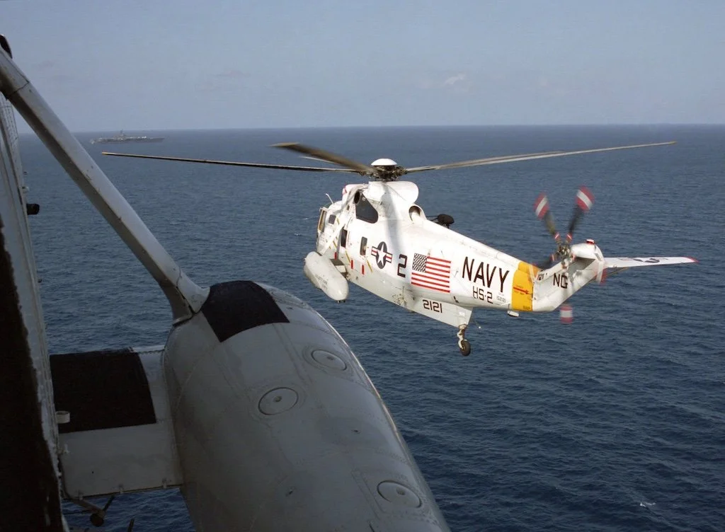 SH-3H Sea King - BuNo 152121, MSN 61-315 - while assigned to Helicopter Antisubmarine Squadron TWO (HS-2). It is seen flying over the Indian Ocean in February 1987. Photo: U.S. Navy by PHS Edward Martens