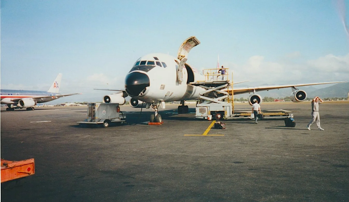 Below: On the cargo ramp in some South American country - an Airborne Express DC-8. Photo: A.A.S.
